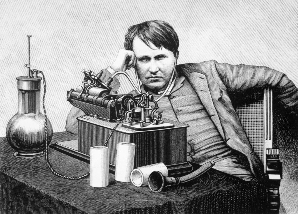 Thomas Edison listening to a recording on the phonograph that he invented, in Menlo Park, New Jersey, circa 1880. Photo by Popperfoto/Getty Images